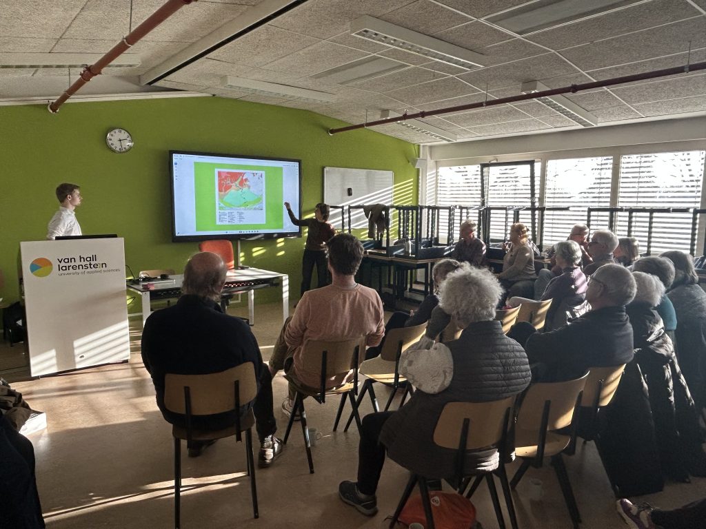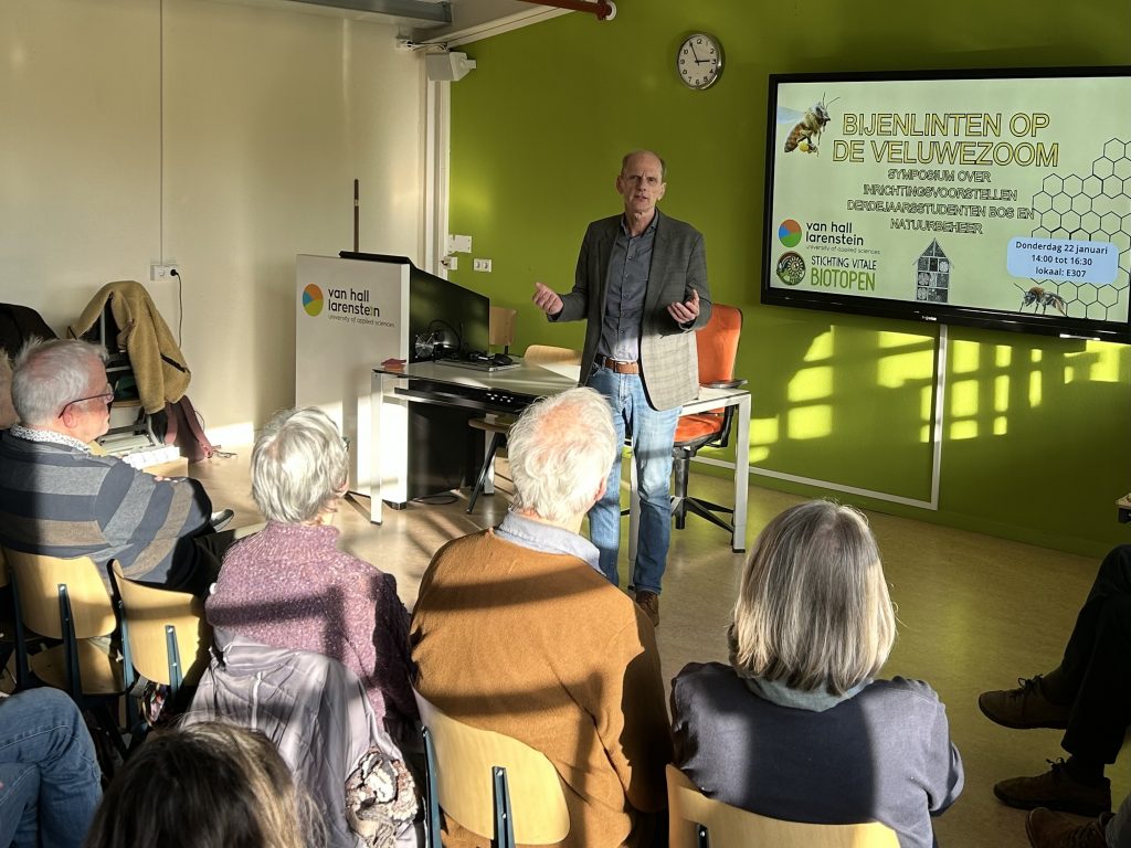 Studenten, docenten, vrijwilligers van initiatieven zoals Dieren Zoemt en Arnhem Zoemt, ecologen van de gemeente Rheden, Rozendaal en Arnhem, deelnemende tuineigenaren, initiatiefnemer Stichting Vitale Biotopen… in een grote collegezaal van Hogeschool van Hall Larenstein in Velp zit het deze donderdagmiddag tjokvol mensen met hart voor biodiversiteit en de wilde bij in het bijzonder.
