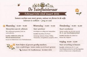 Samenwerken aan meer groen, natuur en dieren in de wijk? De Tuinfluisteraar organiseert diverse activiteiten voor een groenere buurt. Denk aan meewerken in de volkstuin en meer uitleg over duurzame onderwerpen zoals biodiversiteit en houtverwerking. Meer informatie vind je hier: